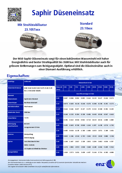 Diese Edelstahl-Diamanteinsätze und Edelstahl-Saphireinsätze (Saphirdüsen, Diamantdüsen) sind den Mitbewerberprodukten deutlich überlegen und leistungsstärker als Einsätze aus Materialien wie Keramik oder Stahl. Dies ist auf einen sehr kompakten und aggressiven Wasserstrahl zurückzuführen. Der integrierte Strahlstabilisator sorgt für einen gebündelten und leistungsstarken Wasserstrahl. Die Standzeit eines Saphireinsatzes ist deutlich höher als jene von gehärteten Stahldüsen oder anderen gebohrten Einsätzen. Saphireinsätze werden hauptsächlich für die Reinwasserstrahltechnik verwendet. Für Recyclingwasser (aufbereitetes Wasser) sind Saphireinsätze nicht geeignet.